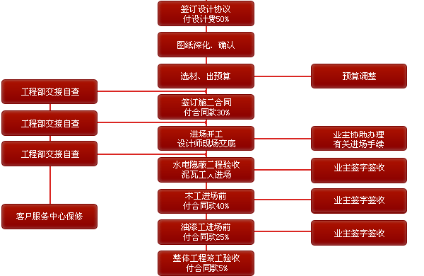1.前期設(shè)計 -- 2.主體拆改 -- 3.水電改造 -- 4.木工 -- 5.貼磚 -- 6.刷墻面漆 -- 7.熱水器安裝 -- 8.廚衛(wèi)吊頂 -- 9.櫥柜安裝-- 10.煙機灶安裝 -- 11.木門安裝 -- 12.地板安裝 -- 13.鋪貼壁紙 -- 14. 開關(guān)插座安裝 -- 15.燈具安裝 -- 16.五金潔具安裝 -- 17.窗簾桿安裝 -- 18.拓荒保潔 -- 19.家具進場 -- 20.家電安裝 -- 21.家居配飾