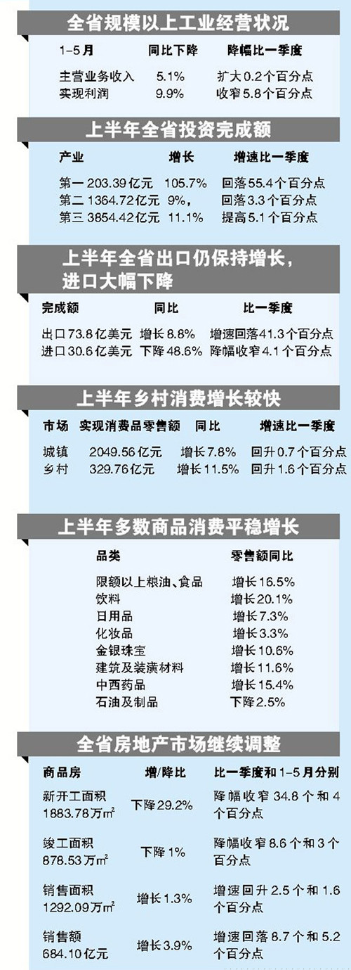 發(fā)布會上,統(tǒng)計局相關負責人表示,今年上半年,全省經濟運行經歷了一季度的低迷后,在各項穩(wěn)增長政策的有力作用下,各項經濟指標從二季度開始回歸到平穩(wěn)增長的軌道,并呈現企穩(wěn)回升向好的積極態(tài)勢。但穩(wěn)增長壓力依然較大,經濟回升的基礎仍有待夯實。隨著狠抓穩(wěn)增長、促改革、調結構、惠民生、防風險政策措施的落實到位,第三季度將進一步鞏固經濟運行回升向好的勢頭,第四季度向著全年預期發(fā)展目標攻堅沖刺,努力實現各項目標任務。